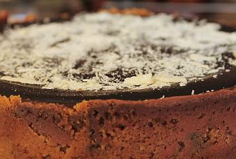 5. En un cazo poner a fuego medio la nata y llevarlo a ebullición. Retirar del fuego e incorporarlo al chocolate troceado. Mezclar hasta que tenga una consistencia lisa y homogénea. Extender la cobertura sobre la tarta con la ayuda de una espátula.