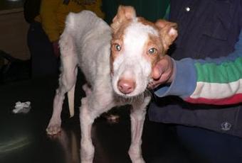 Chesco el pasado jueves era un ovillo de huesos, tiritando de frío en medio de un descampado. No sabemos cómo llegó allí, pero quizá fuera obra de algun alma despiadada. Con un poquito de comida , calor y cariño, sigue siendo , cinco días después, un saco de huesos pero con muchas ganas de vivir.