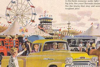 En la vieja publicidad también se ve un fragmento de un camión de la línea Task Forcede Chevrolet de color rojo, ubicado en la parte izquierda. Y al fondo se ve algo de otro camión de color blanco. La ilustración nos ubica en una de esas típicas ferias de campo de Estados Unidos, que hemos visto en más de una película.