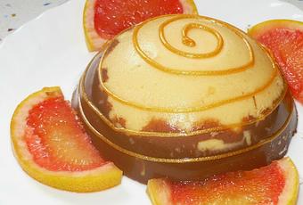 La colocamos en un plato y le ponemos cuatro rodajas de pomelo alrededor de la chiboust y como nos habrá sobrado la mezcla del chocolate, podemos ponerle un poco encima de las rodajas del pomelo para darle otro toque de color y frescura al plato. ;)
