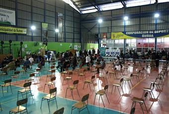 La subsecretaria de Salud Pública, Paula Daza, junto al vocero de La Moneda, Jaime Bellolio, y al alcalde de Ñuñoa, Andrés Zarhi, dieron inicio, en el Polideportivo de la comuna, al proceso de vacunación de población sana, con las personas de 59 años.