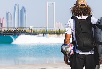 Para lograrlo, “Ardilla” utilizó una tabla de surf modificada sujeta a sus pies con la que saltó desde el helicóptero. Desde ese momento, “Ardilla” solo contaba con breves segundos para abrir su paracaídas, sobrevolar a toda velocidad el cielo y caer de forma milimétricamente calculada en el centro de olas más nueva del planeta, Surf Abu Dhabi. “Hice cerca de 400 saltos de skysurf. Partí practicando de menos a más: primero con una tabla de skate, después con un longboard, flow surf, un wakesurf, wakeboard, pasé a uno más grande y finalmente pasé a la tabla de surf.”
