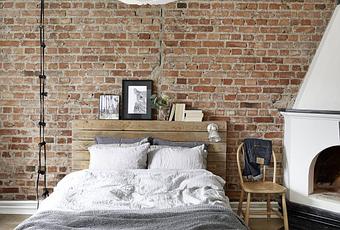Una chimenea en el dormitorio, otra en el salón, muebles reciclados, muebles hechos con palets, pared de ladrillo visto, suelo de madera, alfombras, textiles… este precioso piso sueco es la definición gráfica de acogedor ¿no creéis?