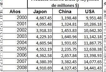 La economía China se acerca a la segunda economía mundial: Japón. Los resultados estadísticos del IMF (International Monetary Fund) nos muestra que el crecimiento desde el año 2000 (a precios corrientes y en US$ dólareas americanos) ha sido excepcional, con tasas de crecimiento muy altas.
