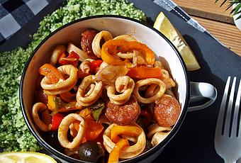Mientras cortamos los chipirones en rodajas y también el chorizo. Ponemos en una sartén aceite cuando empiece a estar caliente añadimos el chorizo. Quitamos las semillas a los pimientos que cortamos en rodajas, se lo añadimos a la sartén, cuando lleve cocinado unos 4 minutos, entonces agregamos los chipirones, la miel, un chorrito de vinagre. También añadimos los dientes de ajo picaditos, las aceitunas enteras y lo salteamos todo unos minutos más.