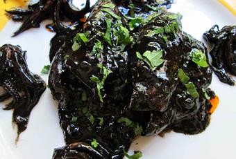 Disolvemos la tinta con un poco de vino. A continuación ponemos el tomate, el vino y la tinta y cocemos diez minutos más. Si hubiera quedado la salsa clara espesamos con un poquito de pan rallado.