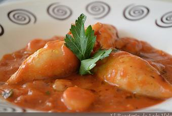 Ahora añade de nuevo los chipirones a la sartén y deja que cuezan a fuego muy lento durante 20 - 25 minutos. Por último, añade una cucharada de pimentón, rectifica de sal y pimienta si hiciera falta y añade la carne de vieiras, las gambas y un poco de perejil picado. Déjalo cocer todo 5 minutos más y retira del fuego.