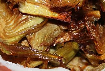 - Freímos las láminas de alcachofa por tandas en una sartén con aceite abundante, hasta que estén crujientes. Colocarlas en un plato con papel de cocina para que se absorba el exceso de aceite. Sazonar al gusto.