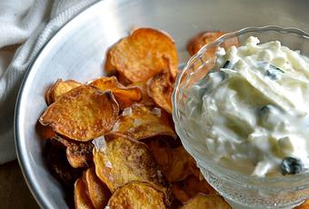 - Rallamos gruesamente la manzana, la rociamos con el zumo de limón y la mezclamos bien con el yogur griego, la hierbabuena picada y el ajo machacado. Dejamos enfriar en la nevera hasta el momento de servir, para ello la colocaremos en un cuenco acompañando los boniatos, que previamente habremos espolvoreado con la sal gorda.
