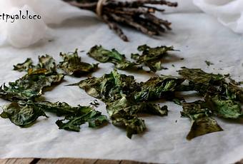 - Mientras se calienta, colocamos las espinacas frescas, limpias, secas y sin tallo sobre un papel vegetal que colocaremos sobre la rejilla del horno o en su defecto una bandeja, separadas entre ellas unos milímetros.