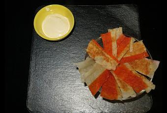 Ingredientes:- Palitos de cangrejo.- Sal.- Salsas para mojar.Elaboración:Lo único que tenemos que hacer en desenrollar los palitos de cangrejo y partirlos en dos o tres trozos, luego se coloca papel de horno en la bandeja del microondas y se ponen encima los trozos de los palitos, no pongáis unos encima de otros porque no se cocinan bien.