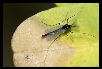 "Los Chironomidos forman una familia con más de 5.000 especies descritas en todo el mundo. Son dípteros (moscas) de tamaño pequeño, de 2 a 10 mm de longitud, asociadas a las masas de aguas continentales en las que se desarrollan las larvas, que suelen ser predadas en grandes cantidades por anfibios, truchas y otros animales acuáticos. Son los dípteros más abundantes en ríos y arroyos. A pesar de la gran dificultad para identificar a las distintas especies, lo que resulta más fácil determinar es el sexo de los ejemplares, gracias a las antenas plumosas que adornan a los machos como el de la imagen."