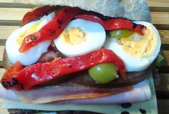 Lavar el tomate y cortarlo en rodajas. Lavar la lechuga y secarla bien.Calentar una sartén con un poquito de aceite y cocinar en ella la carne a fuego fuerte por ambos lados. Salpimentar.Freír también el bacon hasta que esté dorado. Abrir los panes por la mitad, calentarlos en una sartén y untarlos con la mostaza. Colocar encima la lechuga, la carne, el queso, el bacon, el tomate, el huevo duro en rodajas, el jamón, las aceitunas partidas por la mitad y unas tiras de pimiento morrón.