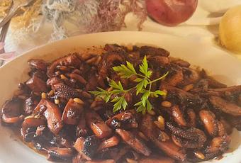 - Ponemos un poco más e aceite en la sartén y sofreímos la cebolla cortada en juliana, el ajo picadito y un poco de sal. Cuando la cebolla empieza a estar transparente, incorporamos de nuevo el choco salteado, los piñones y las especies y algo más de sal. Mezclamos, regamos con el vino, ponemos la hoja de laurel, tapamos la cazuela y dejamos cocinar suavemente hasta que el choco esté tierno. El tiempo de cocción depende de el tipo de choco. Los míos tardaron en hacerse 25 minutos. Eran dos medianos, comprados frescos y congelados unos días.