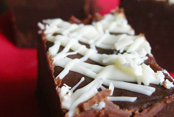 Derretimos el chocolate blanco en el microondas, a golpes cortos de 20-30 segundos cada uno. Con ayuda de un tenedor, dejamos caer hilos de chocolate derretido sobre el fudge dibujando líneas entrecruzadas o lo que más nos guste.Introducimos el fudge en la nevera y lo dejamos reposar hasta que enfríe completamente (1-2 horas serán suficiente).