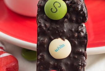 Imposible resistirse a unas barritas de chocolate negro con almendra crocanti, coco rallado, muesli y naranja confitada. Sí además las decoramos con lacasitos, los peques de la casa nos las quitarán de las manos.