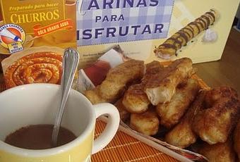 - Churros para 4 personas: Preparar la masa poniendo en un bol 300 ml. de agua tibia y añadir poco a poco 250 grs. de preparado para churros “Harimsa”, mezclar bien con una varilla, hasta que tenga cierta consistencia y no tenga grumos. Dejar reposar 15´. Pasar la masa a una manga pastelera. Poner a calentar una sartén con abundante aceite y echar la masa con ayuda de la manga, en tiras o en espiral. Dorar bien y escurrir el aceite en papel de cocina. Servir espolvoreados con azúcar.