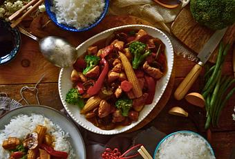 Para el pollo:2 pechugas de pollo, cortado en trozos pequeños1/2 pimiento verde de asar grande, cortado en tiras1/2 pimiento rojo de asar grande, cortado en tiras1/2 cebolla grande, en rodajas1 zanahoria grande, en rodajas100 gr. de champiñones frescos, en rodajas100 gr. de brócoli, solo floretes75 gr. de habichuelas finas redondas, cortadas en trozos medianos50 gr. de caldo5 mazorquitas de maíz, cortadas a la mitad a lo largoAceite vegetalAceite de sésamoSal y pimientaPara la salsa: