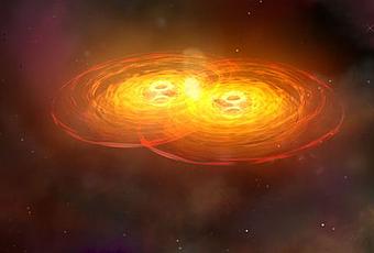 Representación artística de uno de los pasos previos a la fusión de dos agujeros negros.