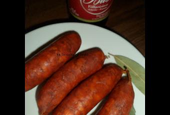 - En una olla ponemos los chorizos, la sidra Mayador hasta cubrir y dos hojas de laurel. Añadimos también una pizquita de sal, muy poca.