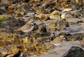 Del otro chorlitejo, el grande, hay un grupo establecido desde el viernes de 6 aves, es curiosa la atracción que ejerce la playa de Bañugues sobre esta especie. La mayor parte son adultos en plumaje nupcial.