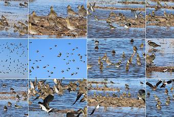 Movimiento en vuelo de chorlitos y avefrías sobre el cielo despejado.
