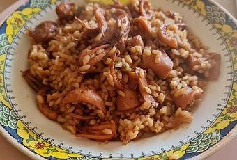 - En la cazuela en que vamos a cocinar el arroz, ponemos tres cucharada de aceite de oliva, añadimos la cebolla y un poquitos de sal, sofreímos unos minutos (3-4), incorporamos el pimiento lo dejamos cocinar un par de minutos y añadimos el ajo, removemos para mezclar todos los ingredientes dejamos hacer un minuto más. Añadimos las choupas y dejamos cocinar hasta que se evapore el agua que van soltando. Es el momento de añadir el pimentón y salpimentar, cubrimos con el caldo caliente y dejamos cocer tapado unos 12-15 minutos, echamos el arroz y seguimos la cocción 15 minutos más, añadiendo más liquido si fuese necesario. Tapamos la cazuela y dejamos reposar 5 minutos.