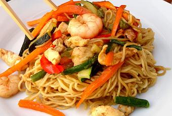 Seguidamente añadimos las verduras, el pollo y las gambas. y lo salteamos todo a fuego vivo. Una vez los fideos estén en su punto, colamos y reservamos.