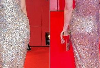 El vestido de la colección de Jenny Packham, mostró su silueta espectacular y sexy. Un clutch en plata, anillo de diamante en color marrón y pendientes gotas complementaron su look.