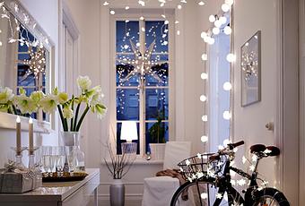 Pequeños adornos que simulan arbolitos y muchas luces, sea ahí que esté con la idea de sólo luces.