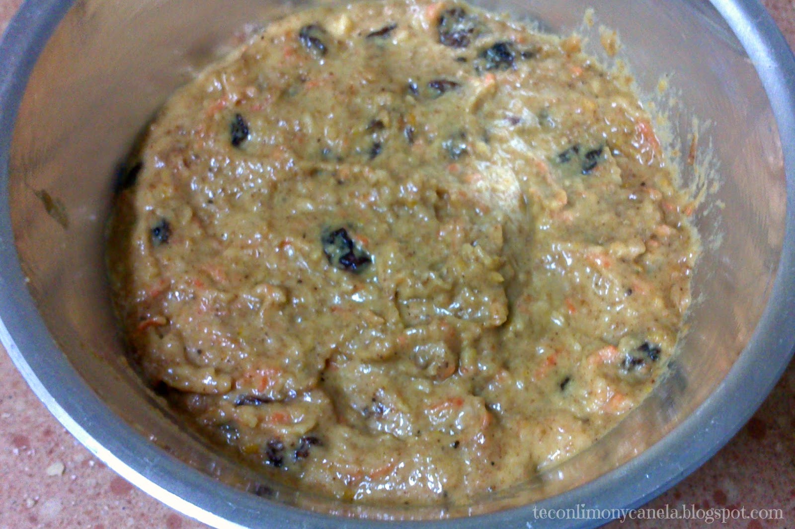 Para hacerlo necesitaréis:- aceite en aerosol para el molde, o en botella que podréis extender con un pincel- 100 g (3 ½ oz) de mantequilla sin sal- 100 g (3 ½ oz) de azúcar moreno- 225 g (8 oz) de harina integral- 2 huevos medianos- 1 clara de huevo mediano- 1 zanahoria grande, pelada y rallada groseramente (para dar aproximadamente 100 g/3 ½ oz)- 1 manzana grande pelada, sin corazón y rallada groseramente (para dar aproximadamente 100 g/3 ½ oz)- 100g (3½ oz) de pasas- 50g (2 oz) de almendras molidas- 3 cucharaditas de levadura- 3 cucharaditas de mezcla de especias - 1cm (½ in) jengibre fresco, pelado y finamente rallada- cáscara finamente rallada de 1 naranja- semillas de la vaina de vainilla o 1 cucharadita de extracto de vainilla- una pizca de salPara acompañar a la hora de servir, habrá que preparar una Crema de Brandy con los siguientes ingredientes:- 150 g (5 oz) de queso crema bajo en grasa- 3 cucharadas de brandy- 1 churretón (alrededor de 25 ml/1 fl oz) de miel o jarabe de arce