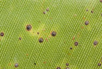Suele afectar a cítricos y plantas ornamentales, como es el caso de esta fotografía. Debajo de este escudo el insecto es de color amarillo o algo anaranjado como vemos en los individuos jóvenes que hay alrededor. Y por último esta curiosa formación circular.