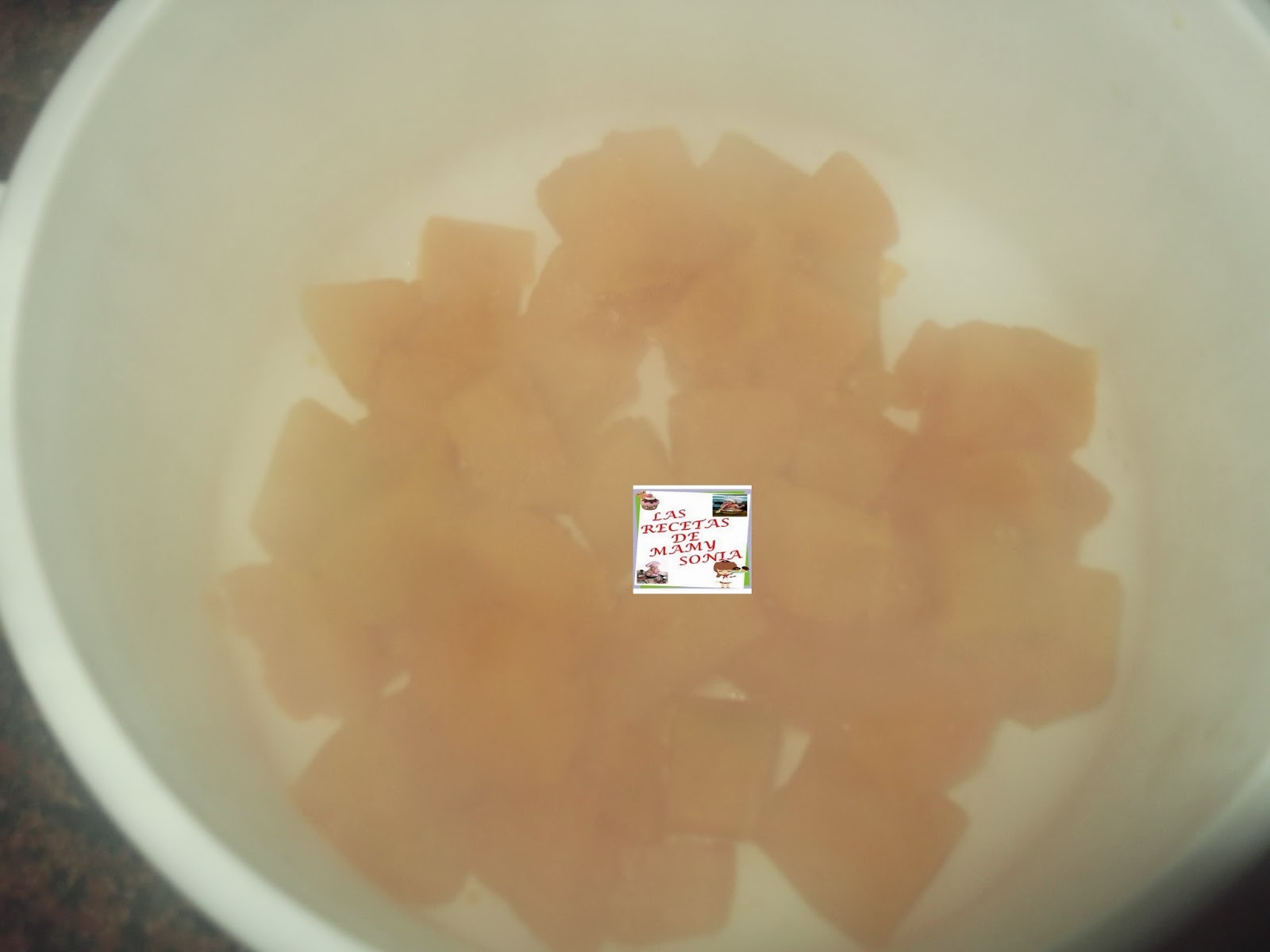Ponemos al fuego un medio vaso de agua con sal y cuando este hirviendo agregamos la calabaza