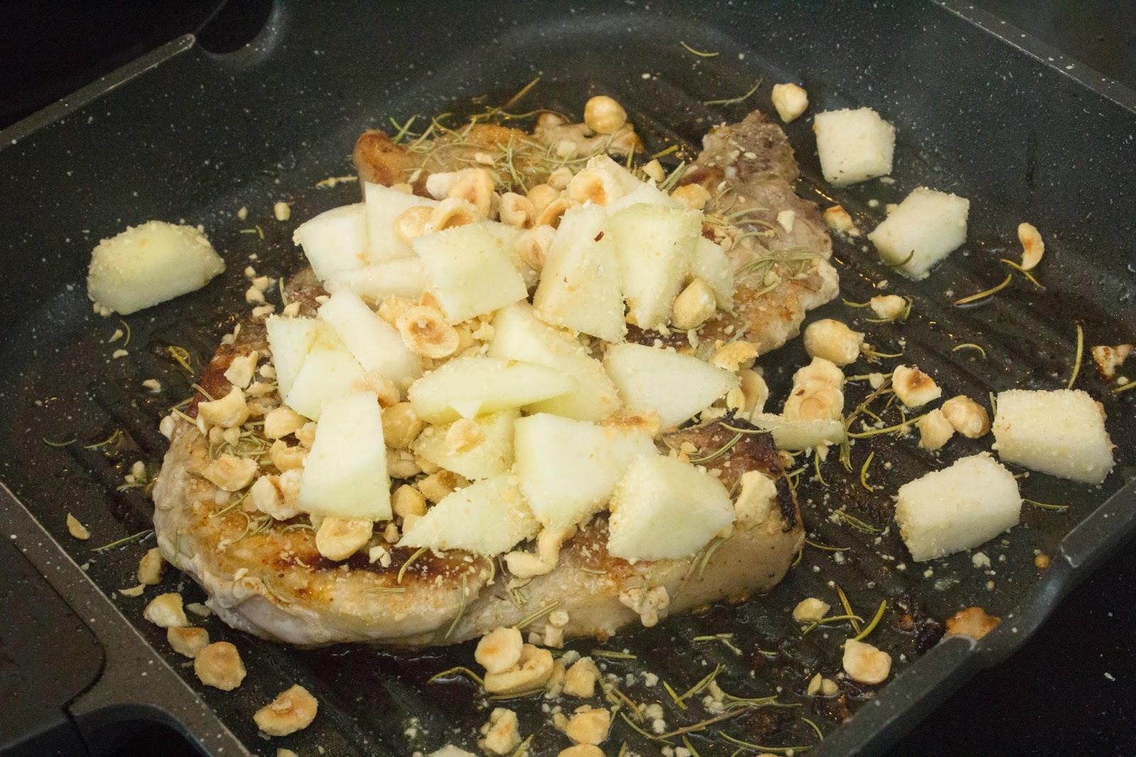 Hoy traigo una chuleta de cerdo con pera y avellanas al romero. Es un plato agridulce, sano y sabroso que os sorprenderá.