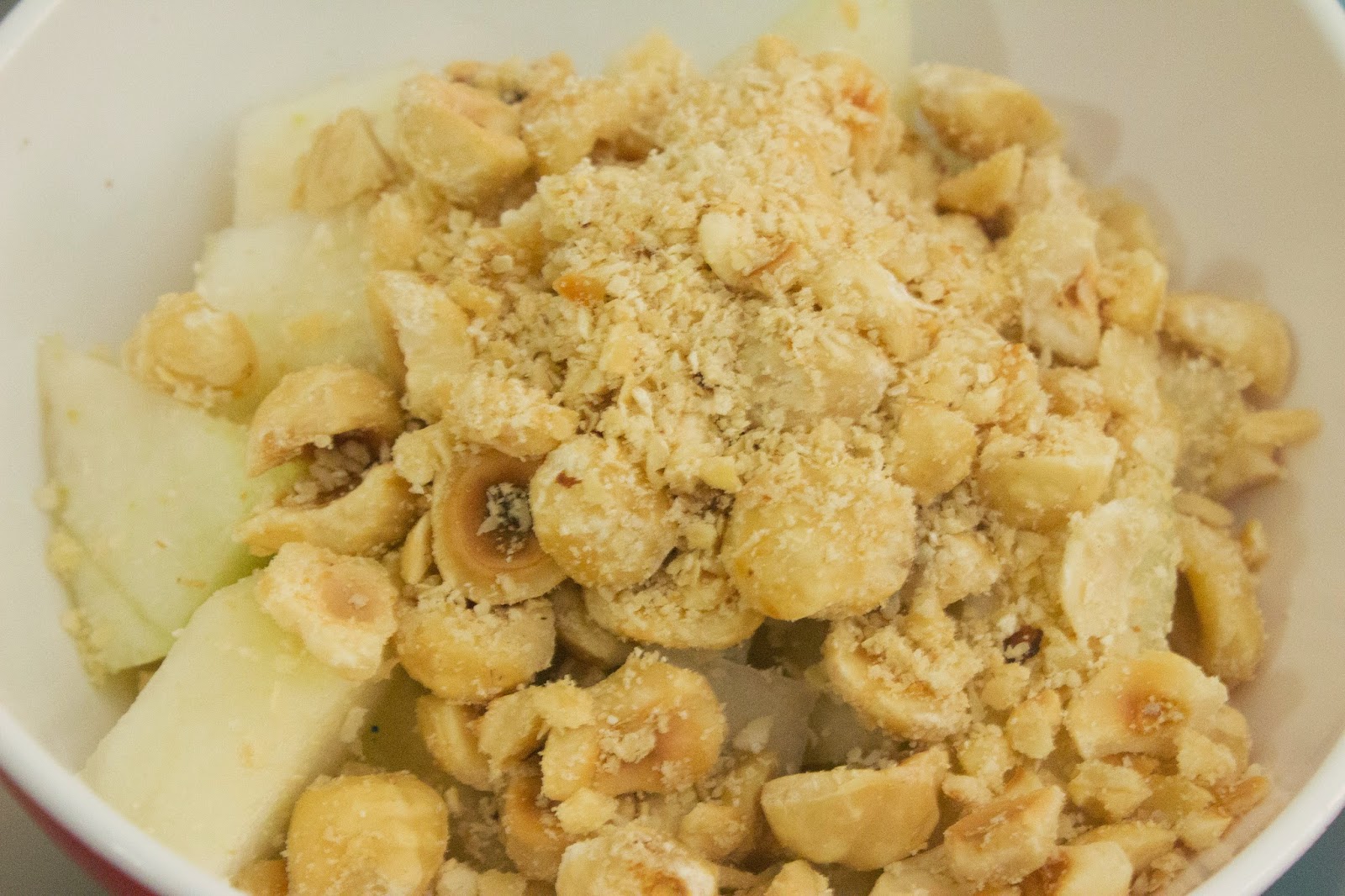 En un mortero pon las avellanas y machacalas un poco. A mi me gusta que hayan cachitos enteros por lo que no las machaco demasiado.