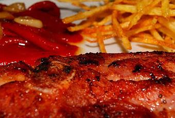 Emplataremos con un par de pimientos del piquillo y la patata paja.