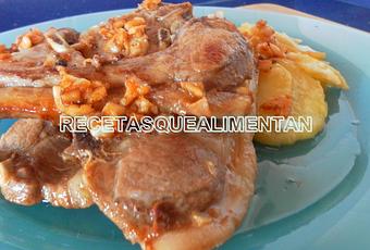 INGREDIENTESUn kg. chuletas de cordero, un kg. patatas, una cabeza de ajos, 50 ml. vinagre, aceite de oliva, pimienta negra molida, una cucharadita de azúcar, 250 ml. agua, sal.