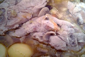 Pochamos en un caldero, con un poco de aceite, una cebolla en trozos y unos dientes de ajo. Cuando comience a coger color incorporamos la zanahoria en rodajas. Transcurridos unos 10 minutos, pondremos el calabacín en trozos. Aderezar al gusto: ajo molido, sal, tomillo,... Esperaremos unos 10-15 minutos para verter una lata de cerveza grande e introducir las papas peladas, pasas y aceitunas. Guisaremos entre 15-20 minutos, momento en el que pondremos las chuletas y cocinaremos durante unos 7-10 minutos más a lo sumo para que se hagan pero no queden resecas o pasadas.¡Listo para comer, que les aproveche!