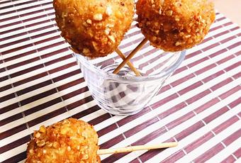 Añadir el queso rallado, el huevo, sal y pimienta y triturar con la batidora hasta que quede una pasta. Con las manos mojadas ir formando bolas del tamaño que más os guste, pincharlas en una minibrocheta, rebozarlas en el polvo de kikos e ir friéndolas en aceite bien caliente.