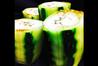 - Lava bien los pepinos, córtales la base y con una mandolina de cocina quítales la piel. Deja si lo deseas algunas partes de la misma sin quitar para dar un toque de color. Córtalos en 3 o 4 partes cada uno de ellos, según sea su tamaño, y con un vaciador extrae las semillas y parte de la carne, cuidando de que no se rompan y dejando una base para que no pierda el contenido. Ya tenemos unos vasos de chupito de pepino.