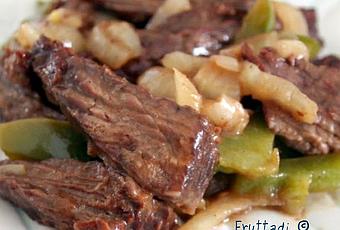 Calienta la plancha o sartén, agrega el aceite, el ajo, añade la carne cocínala a temperatura medium -moderado sin que se queme, Voltea la carne y este cocida al punto que te gusta incorpora la cebolla y los pimientos. Deja cocinar aproximadamente de 15 minutos más.