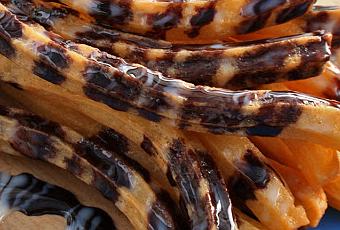 Calentar en una cazuela la taza de agua, la pizca de sal y la cucharada de mantequilla. Cuando comience a hervir, agregar la harina y primero mezclar con una varilla y luego con una espátula sin parar de remover hasta despegar de las paredes de la cazuela. Dejar reposar la masa hasta templar. Caliente abundante aceite en una sartén. Agregue la masa a una manga pastelera con boquilla de estrella fina y vierta en la sartén cortando según el tamaño que desee. Escurra en papel absorbente y sirva esparciendo por encima sirope de chocolate y leche condensada. Fuente: http://www.hogarutil.com/cocina/recetas/postres/201108/churros-9990.html