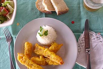 - Con unas Papas sancochadas {hervidas} o fritas también quedan muy ricos. Yo elegí un sencillo arroz en blanco con un hilo de aceite virgen y una buena ensalada. - Si te sobra masa {que te sobrará, seguro} puedes bañar berenjenas, rodajas de pimiento, calabacín, aros de cebolla . . . quedan deliciosas las verduras así.