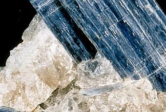 Tambien llamada Kyanita, cristaliza en la forma de estructuras fibrosas, estriadas, a veces enroscadas, en cristales largos, en varas puntiagudas. Los colores son entre el azul celeste y el gris tornasolado, mezclado con blanco y plateado, a veces da unos matices de verde o rosa.