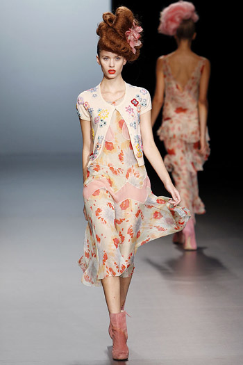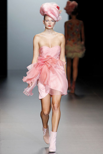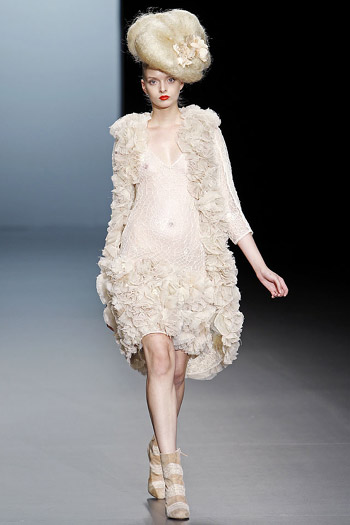Ion Fiz . Su colección es delicada, romántica y sensual, con absoluto protagonismo de los colores claros , pasamos del blanco al crudo, al amarillo, rosa y azul empolvado. Como curiosidad, cuenta con la presencia de su amiga, la presentadora Raquel Sánchez-Silva en su desfile, que lo hace estupendamente.