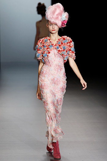María Escoté nos sorprende con vestidos realizados por varias piezas, incluyendo pedrería, enormes imperdibles, diversos tejidos.. llaman la atención los enormes cinturones metálicos con el mensaje "No me olvides". Colección imaginativa y muy visual.