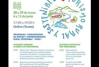 • Turismo Rural Sostenible arranca de forma online el próximo 28 de mayo con una masterclass del experto internacional en el diseño y gestión de destinos turísticos, Arturo Crosby, y continuará el 29 con la exposición de experiencias exitosas de destinos turísticos sostenibles en Albarracín, Brihuega, Sobrarbe y la Comarca de la Sidra.