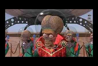 Lo que es innegable es que los verdaderos artistas de la función son los marcianos. Esos pequeños seres son tan divertidos como malvados y las escenas más locas son las protagonizadas por ellos. No voy a hacer un listado de todas las apariciones de los marcianos pero no puedo dejar de nombrar la del ataque a la Tierra, la del congreso o la del misil. De lo mejor de la película. Como curiosidad, os diré que la inspiración original para crear a estos seres ( y la película en general) viene directamente de una colección de cartas de 1962 llamada Mars Attacks! en la que aparecían unos malvados marcianos muy similares a los de la película. Estas cartas o tarjetas son hoy consideradas un objeto de coleccionismo