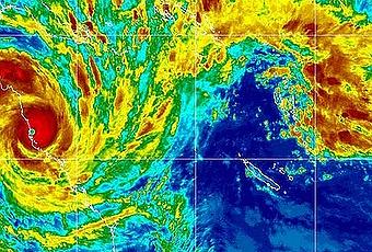 Imagen de satélite que muestra el Ciclón Yasi tocando el norte de Queensland hacia media noche del 3 de febrero de 2010. Crédito: US National Oceanic and Atmosphere.