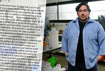 Tuvo tiempo para comentar: “¿Y cómo no voy a tener un pico de estrés? Tengo equipamiento comprado a un dólar oficial que va a llegar el 12 (de diciembre) y no voy a poder retirar de la Aduana por la devaluación que hará Milei. Cuando ves caer los planes bianuales de proyectos a pedazos y, lo peor y más conmovedor de todo, cuando becarios y pasantes brillantes con los que uno trabaja vienen a preguntarte si sus becas continúan o cómo sigue su futuro”.